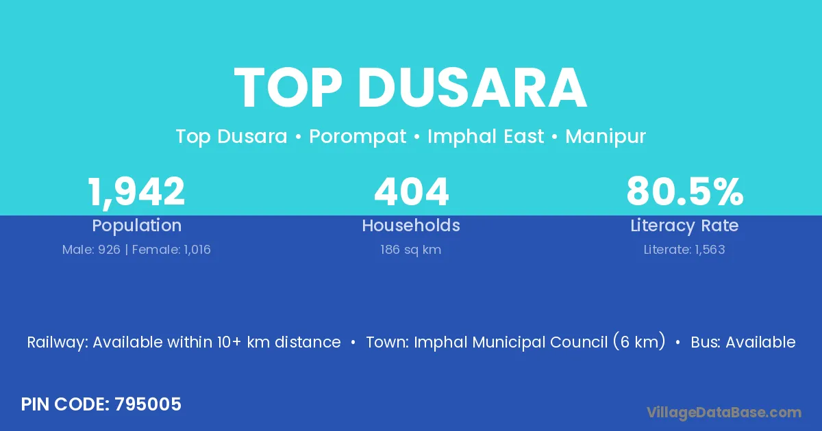 Imphal Municipal Council (6 km) is the nearest town to Top Dusara village for major economic activities and is located approximately 6 km away.