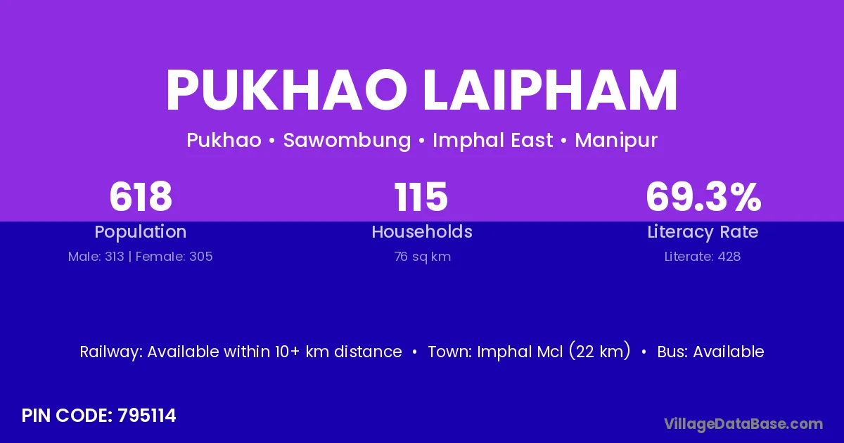 Imphal Mcl (22 km) is the nearest town to Pukhao Laipham village for major economic activities and is located approximately 22 km away.