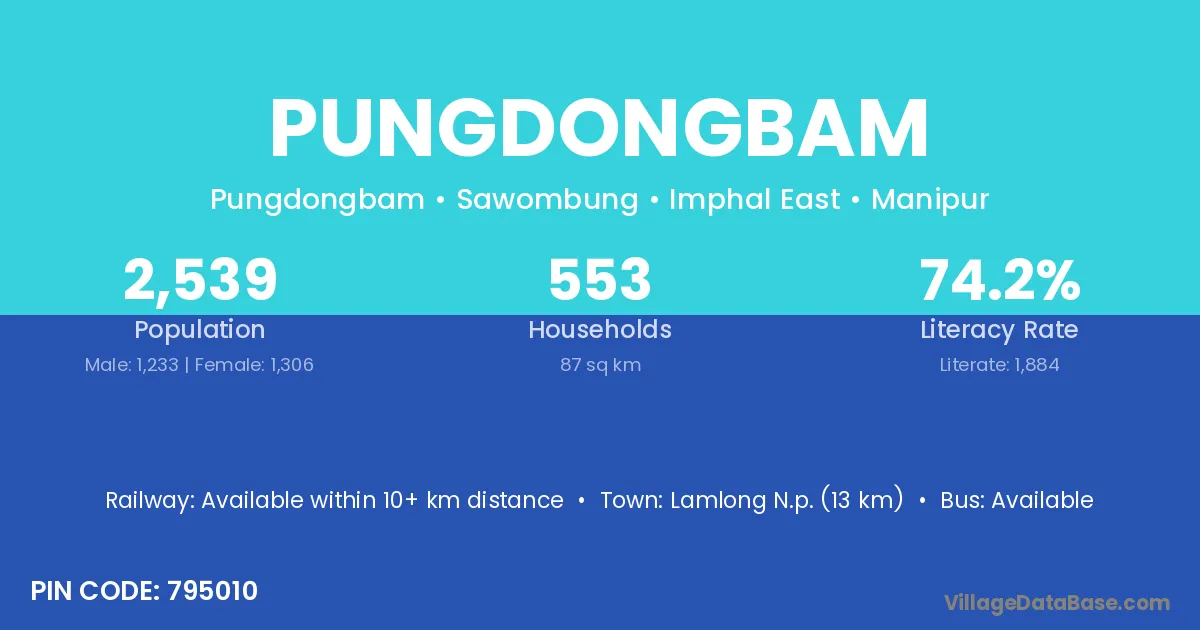 Lamlong N.p. (13 km) is the nearest town to Pungdongbam village for major economic activities and is located approximately 13 km away.