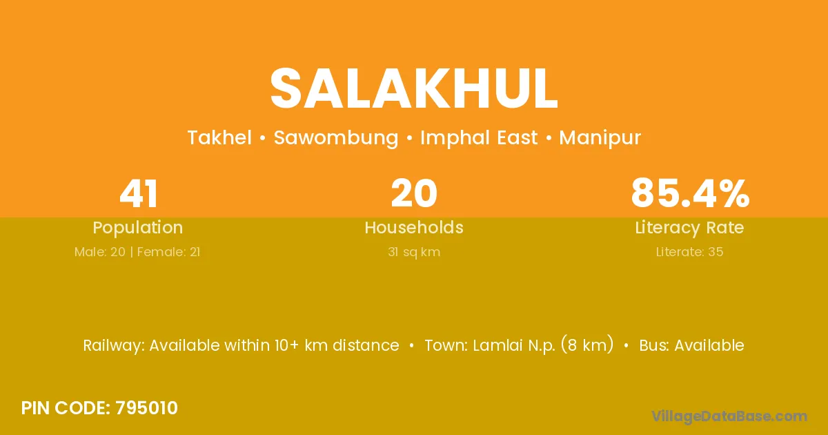 Lamlai N.p. (8 km) is the nearest town to Salakhul village for major economic activities and is located approximately 8 km away.