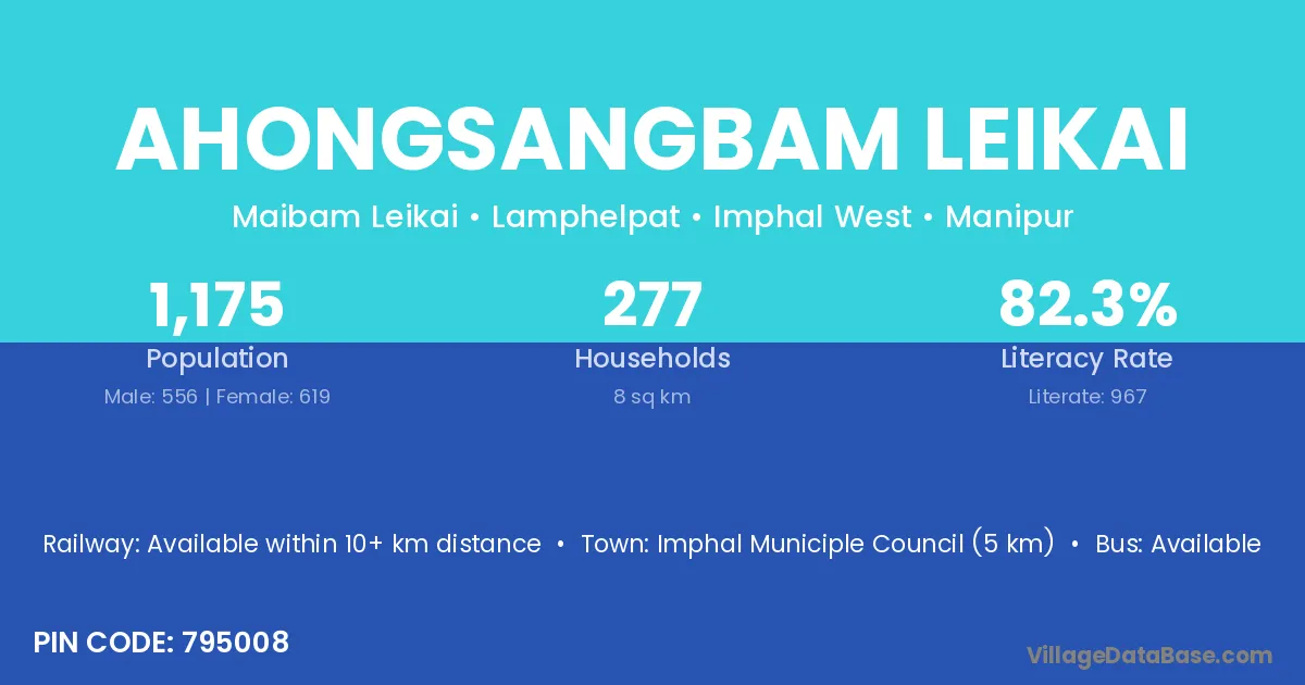 Imphal Municiple Council (5 km) is the nearest town to Ahongsangbam Leikai village for major economic activities and is located approximately 5 km away.