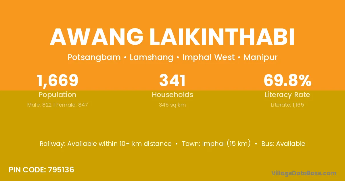 Awang Laikinthabi village has a total population of 1,669 people, of which 822 are males and 847 are females.