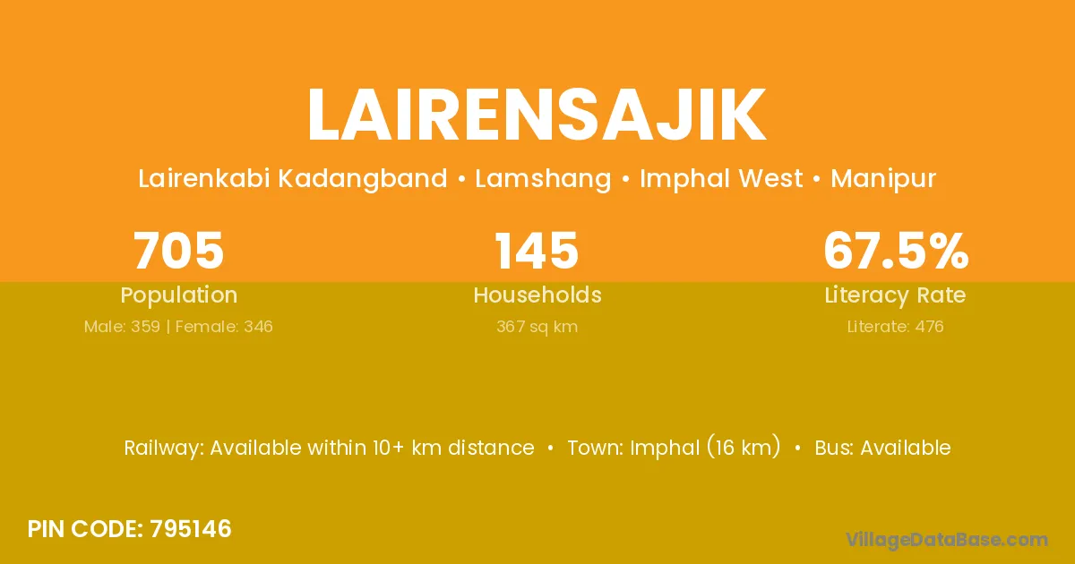 Imphal (16 km) is the nearest town to Lairensajik village for major economic activities and is located approximately 16 km away.