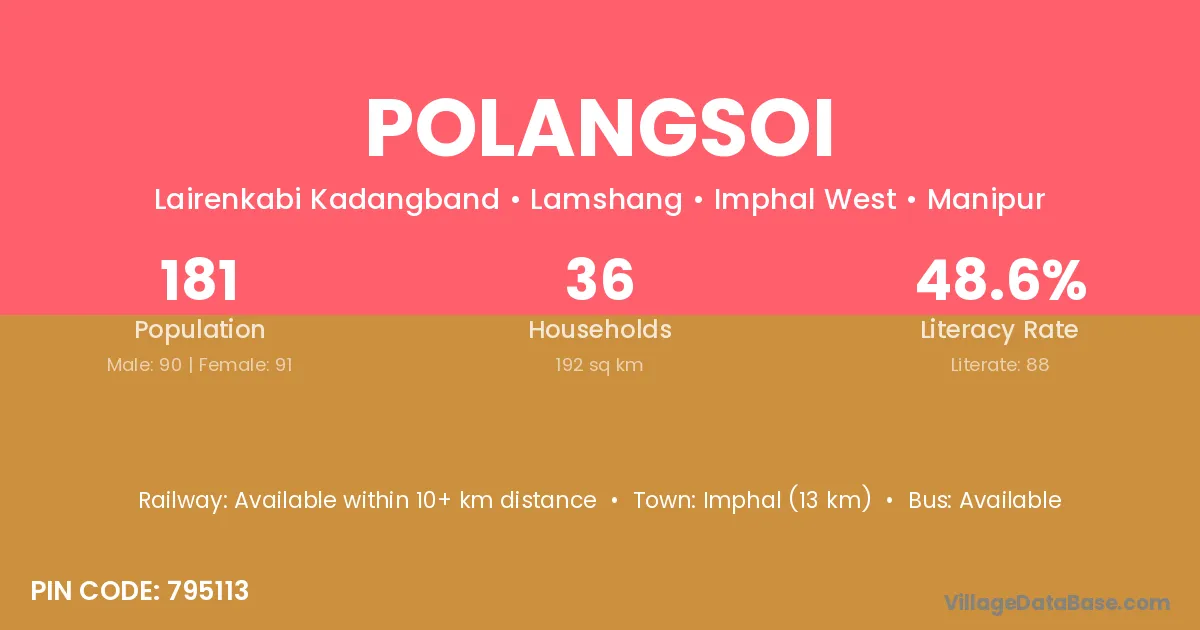 Imphal (13 km) is the nearest town to Polangsoi village for major economic activities and is located approximately 13 km away.