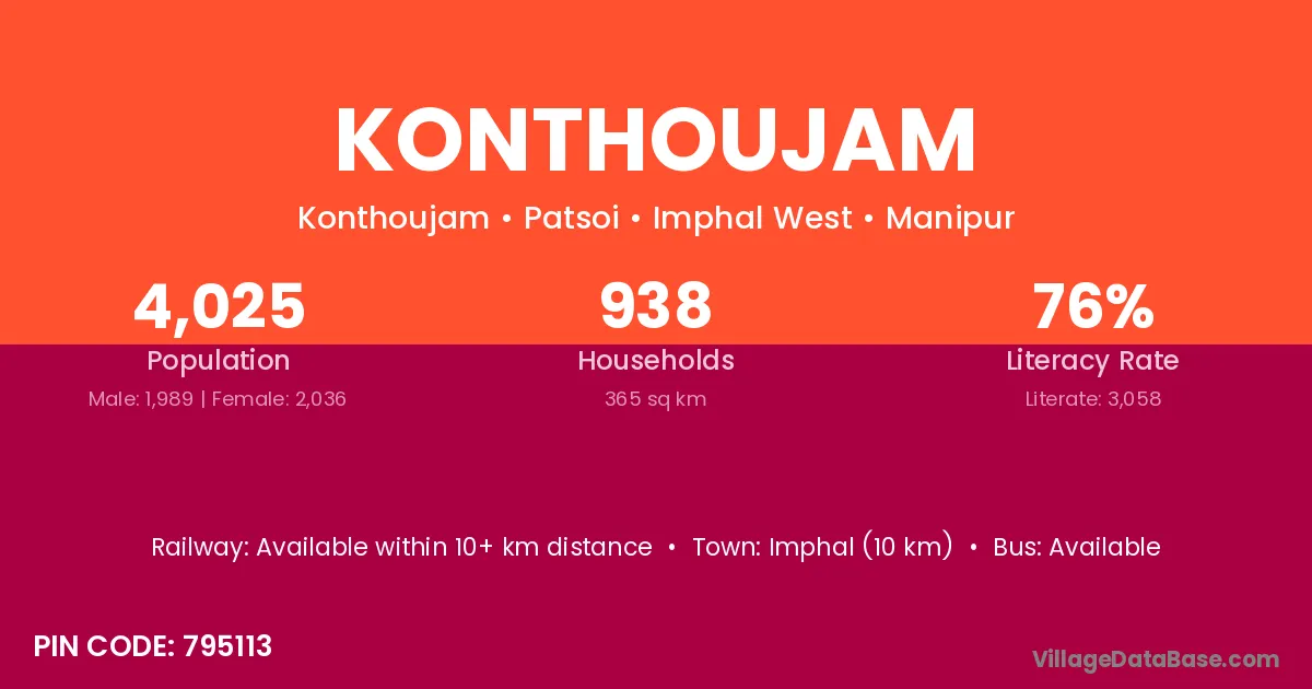 Konthoujam village has a total population of 4,025 people, of which 1,989 are males and 2,036 are females.