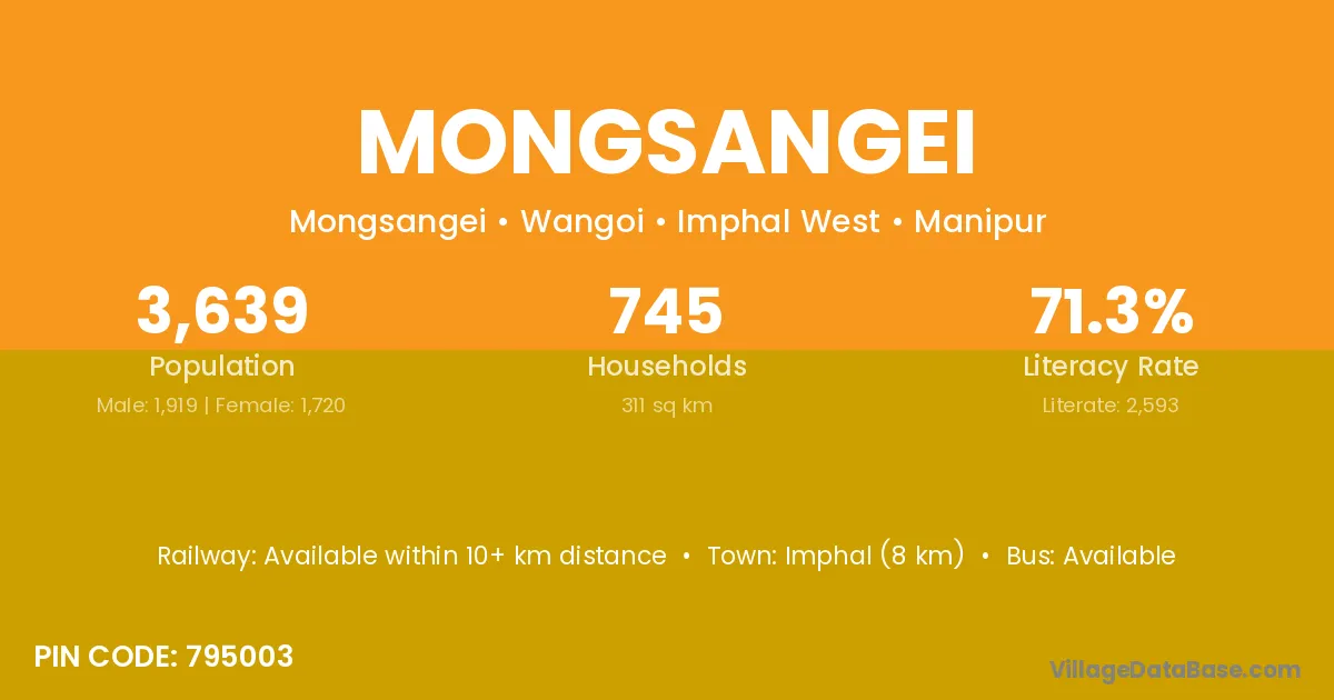 Imphal (8 km) is the nearest town to Mongsangei village for major economic activities and is located approximately 8 km away.
