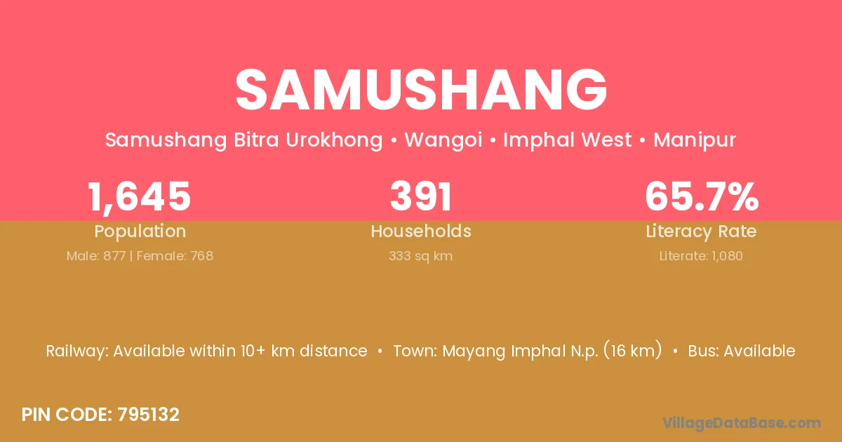 Mayang Imphal N.p. (16 km) is the nearest town to Samushang village for major economic activities and is located approximately 16 km away.