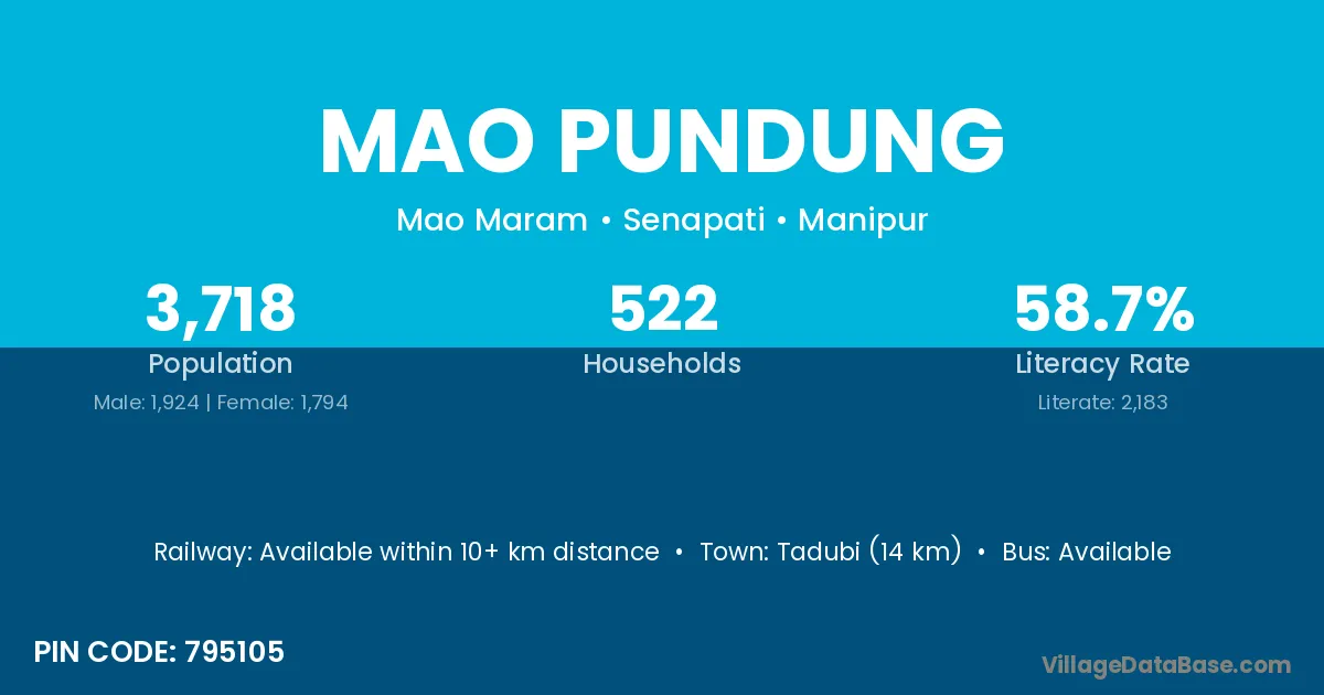Mao Pundung village has a total population of 3,718 people, of which 1,924 are males and 1,794 are females.