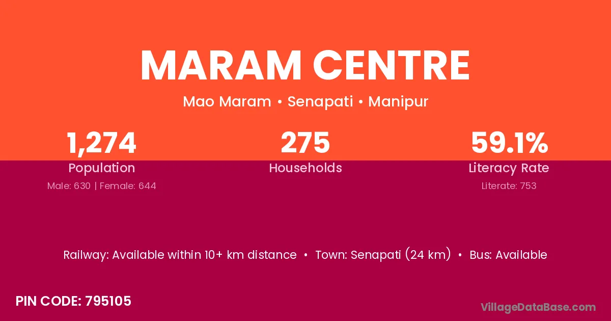 Senapati (24 km) is the nearest town to Maram Centre village for major economic activities and is located approximately 24 km away.