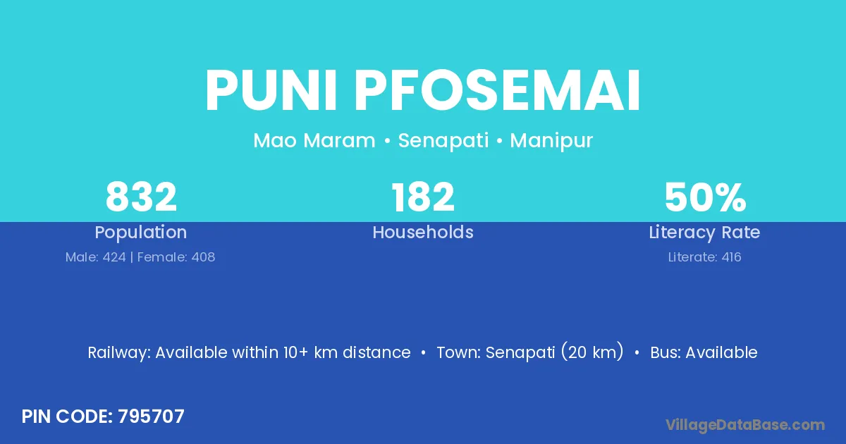 Senapati (20 km) is the nearest town to Puni Pfosemai village for major economic activities and is located approximately 20 km away.