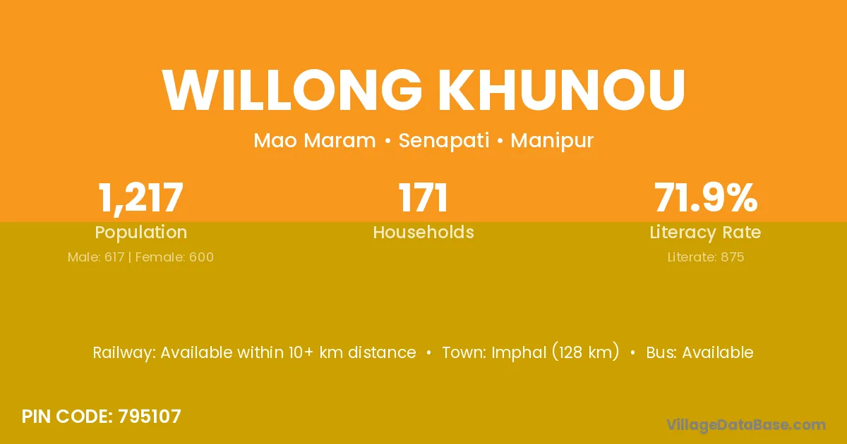 Willong Khunou village has a total population of 1,217 people, of which 617 are males and 600 are females.