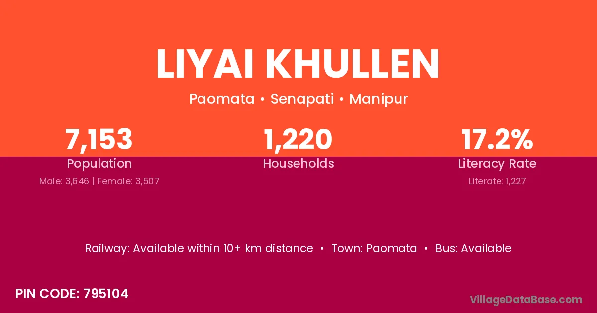 Liyai Khullen village has a total population of 7,153 people, of which 3,646 are males and 3,507 are females.