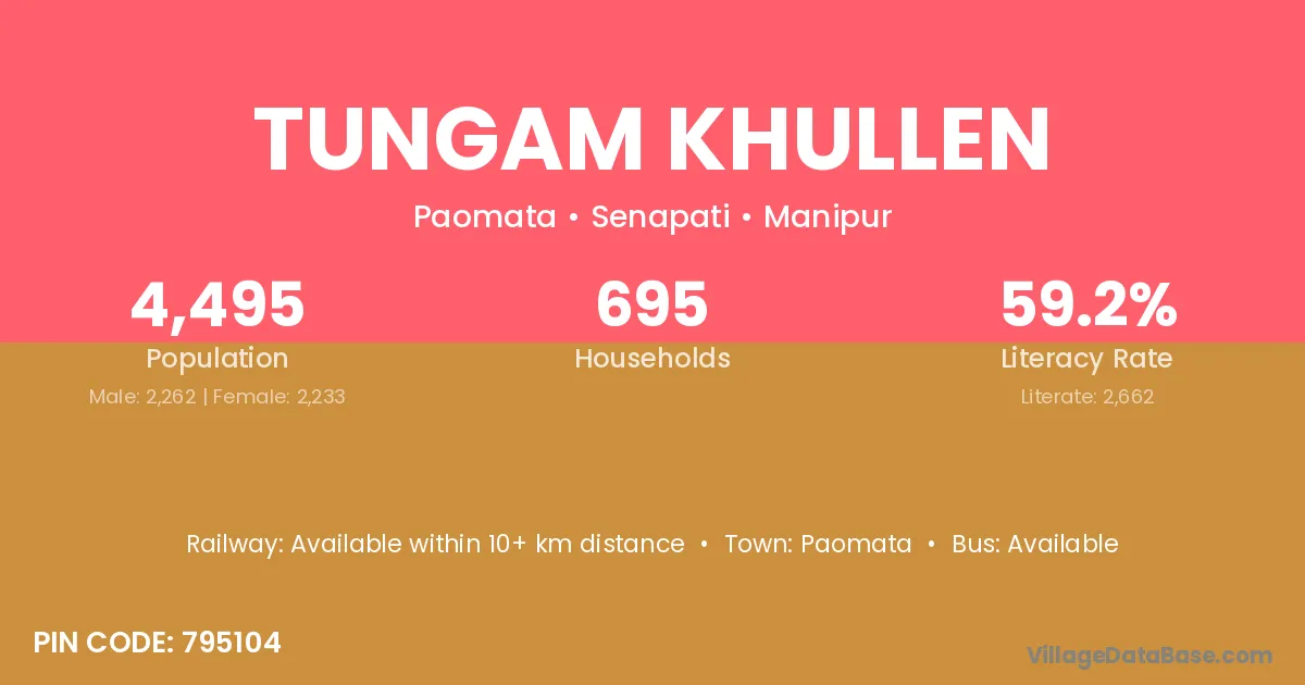 Tungam Khullen village has a total population of 4,495 people, of which 2,262 are males and 2,233 are females.