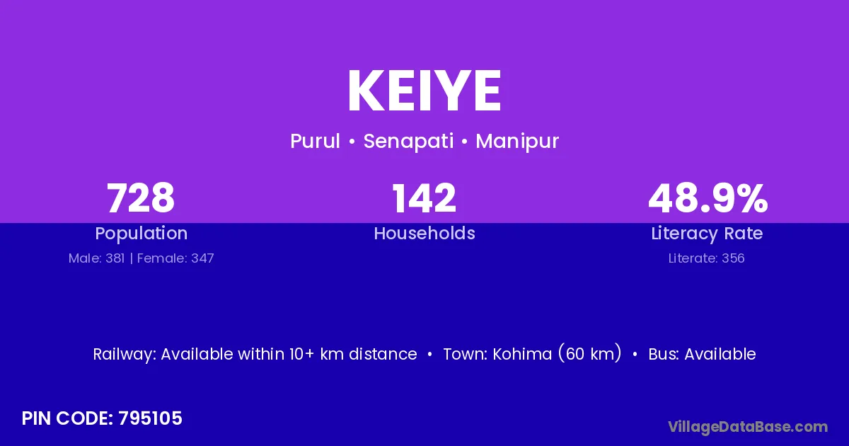 Kohima (60 km) is the nearest town to Keiye village for major economic activities and is located approximately 60 km away.