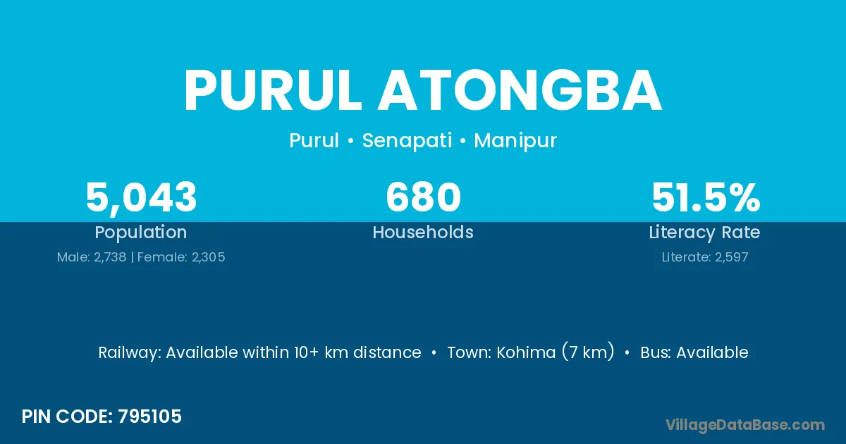 Kohima (7 km) is the nearest town to Purul Atongba village for major economic activities and is located approximately 7 km away.