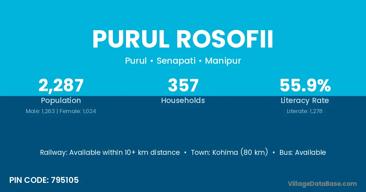 Kohima (80 km) is the nearest town to Purul Rosofii village for major economic activities and is located approximately 80 km away.