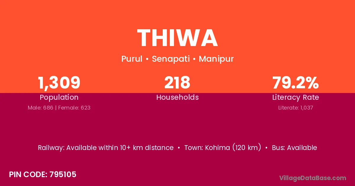Kohima (120 km) is the nearest town to Thiwa village for major economic activities and is located approximately 120 km away.