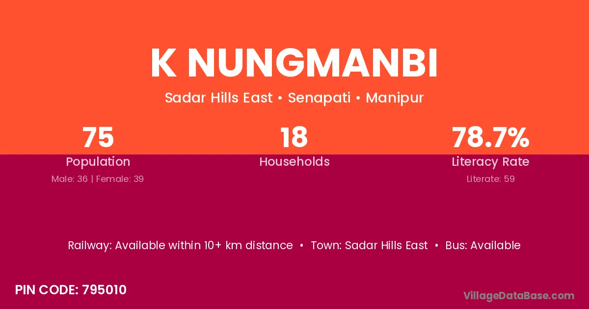 K Nungmanbi village has a total population of 75 people, of which 36 are males and 39 are females.