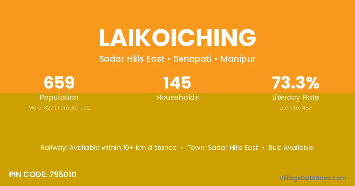 Laikoiching village has a total population of 659 people, of which 327 are males and 332 are females.