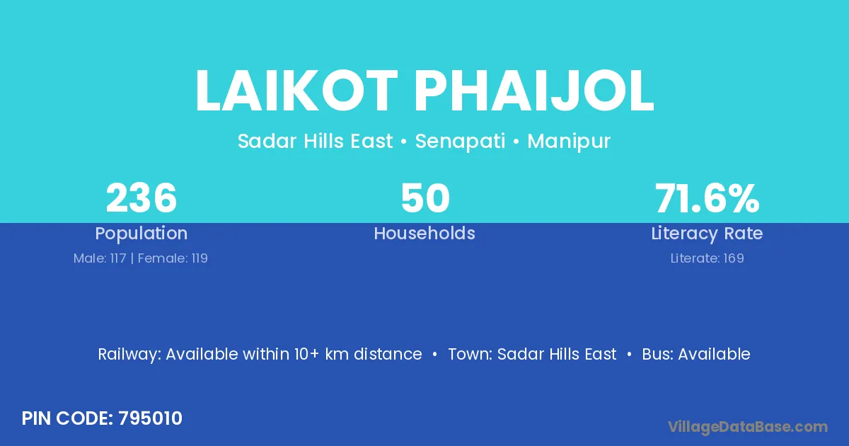 Laikot Phaijol village has a total population of 236 people, of which 117 are males and 119 are females.