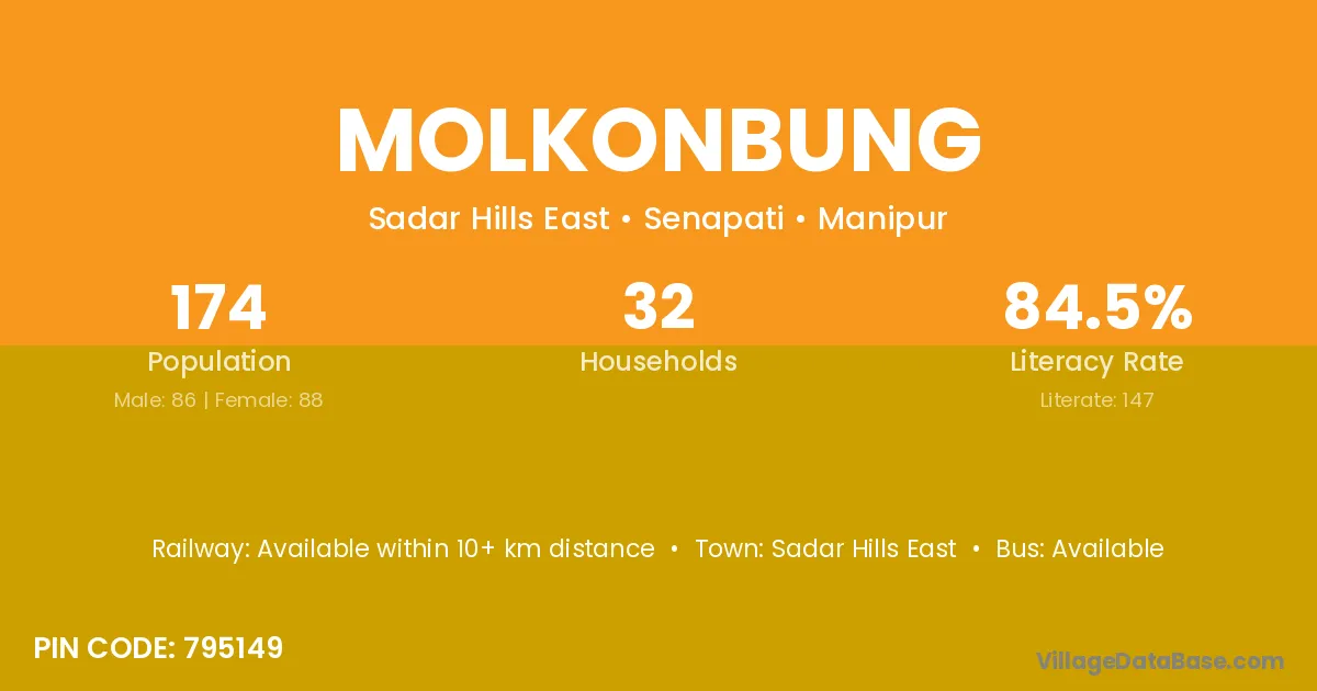 Molkonbung village has a total population of 174 people, of which 86 are males and 88 are females.