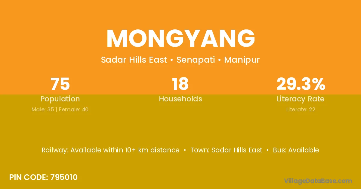 Mongyang village has a total population of 75 people, of which 35 are males and 40 are females.