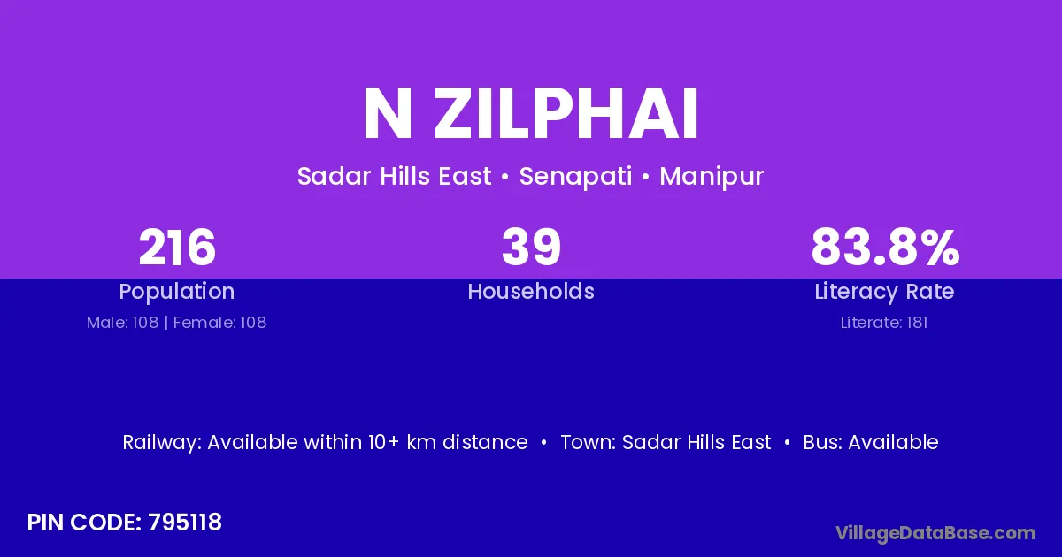 N Zilphai village has a total population of 216 people, of which 108 are males and 108 are females.