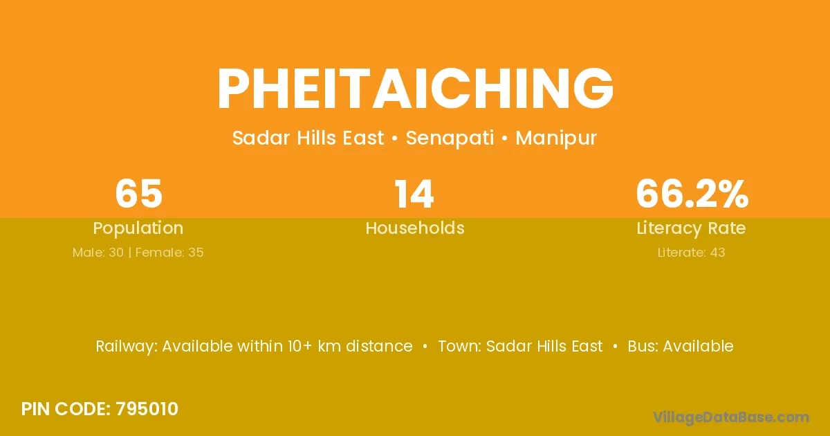 Pheitaiching village has a total population of 65 people, of which 30 are males and 35 are females.
