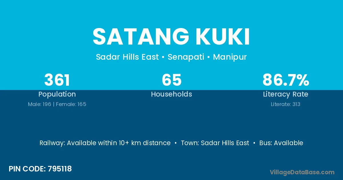 Satang Kuki village has a total population of 361 people, of which 196 are males and 165 are females.