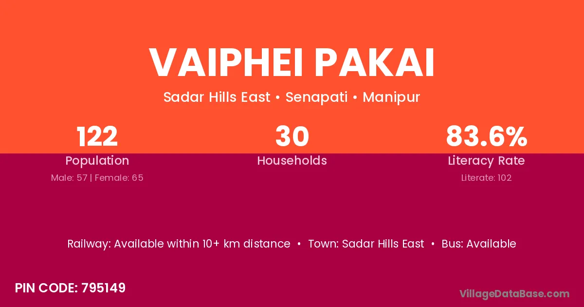 Vaiphei Pakai village has a total population of 122 people, of which 57 are males and 65 are females.