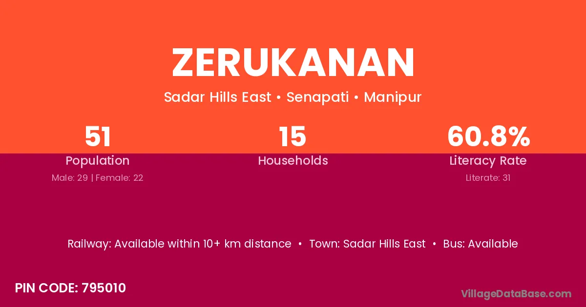Zerukanan village has a total population of 51 people, of which 29 are males and 22 are females.