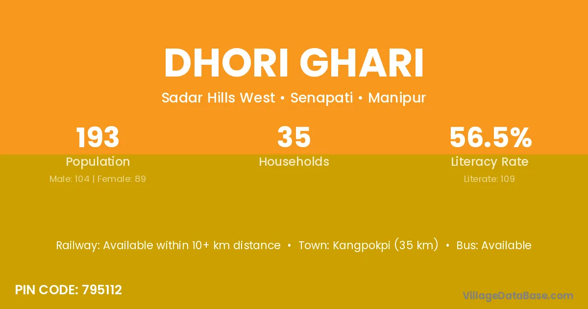 Kangpokpi (35 km) is the nearest town to Dhori Ghari village for major economic activities and is located approximately 35 km away.