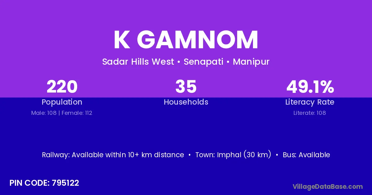 Imphal (30 km) is the nearest town to K Gamnom village for major economic activities and is located approximately 30 km away.