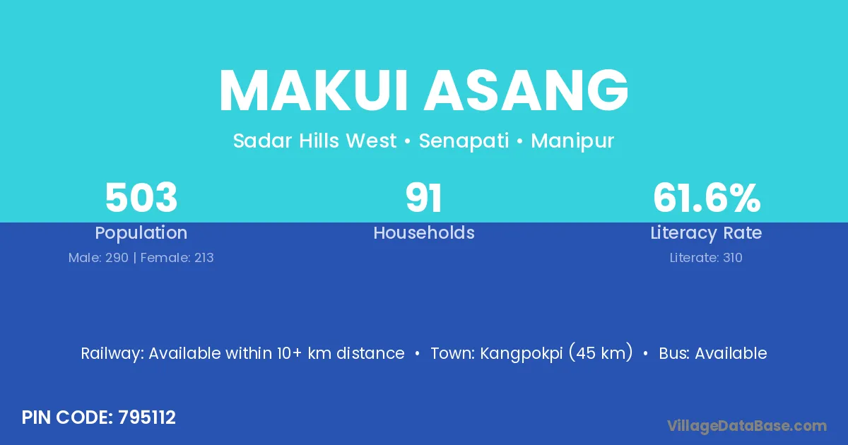 Kangpokpi (45 km) is the nearest town to Makui Asang village for major economic activities and is located approximately 45 km away.