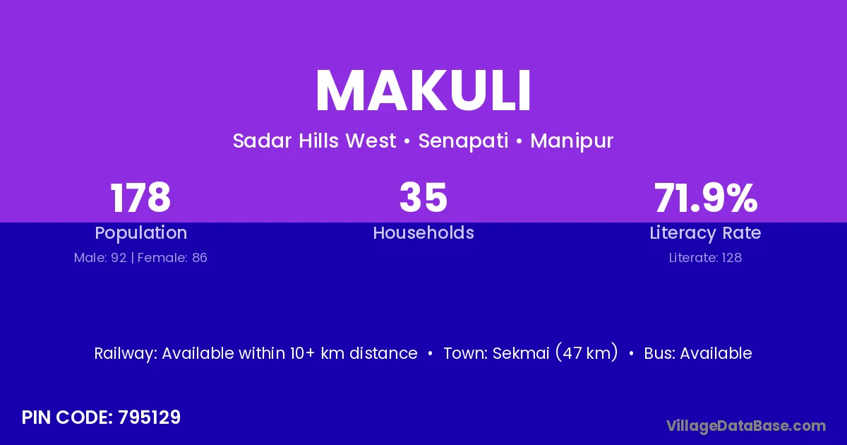 Sekmai (47 km) is the nearest town to Makuli village for major economic activities and is located approximately 47 km away.