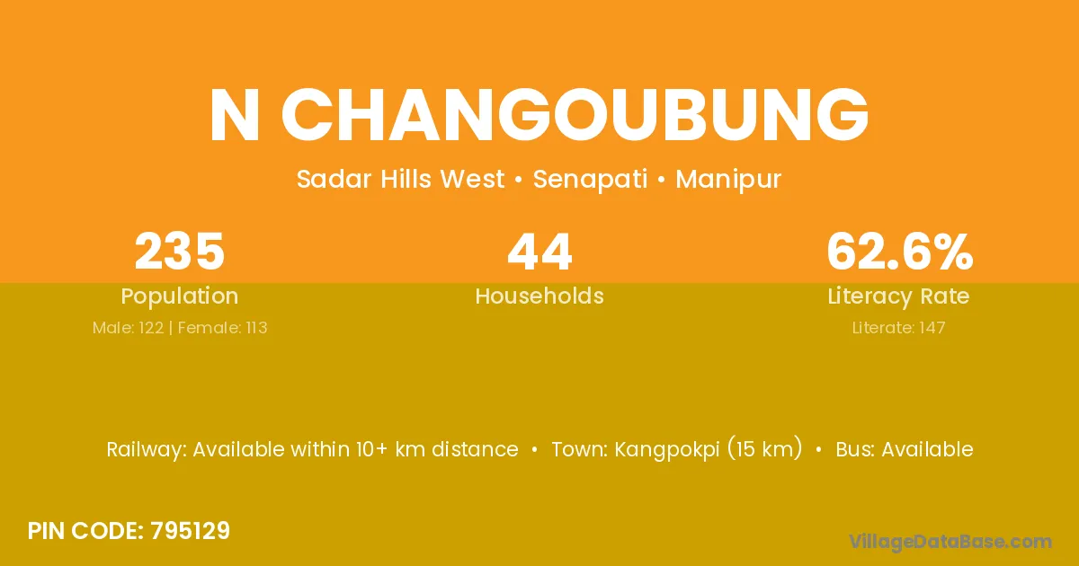Kangpokpi (15 km) is the nearest town to N Changoubung village for major economic activities and is located approximately 15 km away.