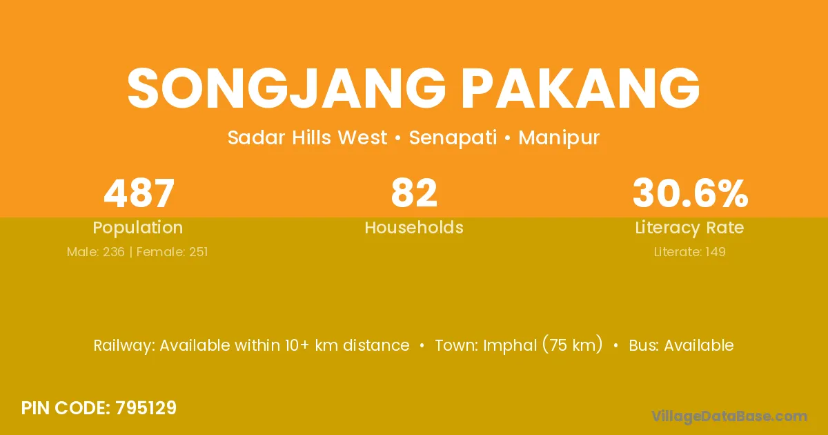 Imphal (75 km) is the nearest town to Songjang Pakang village for major economic activities and is located approximately 75 km away.