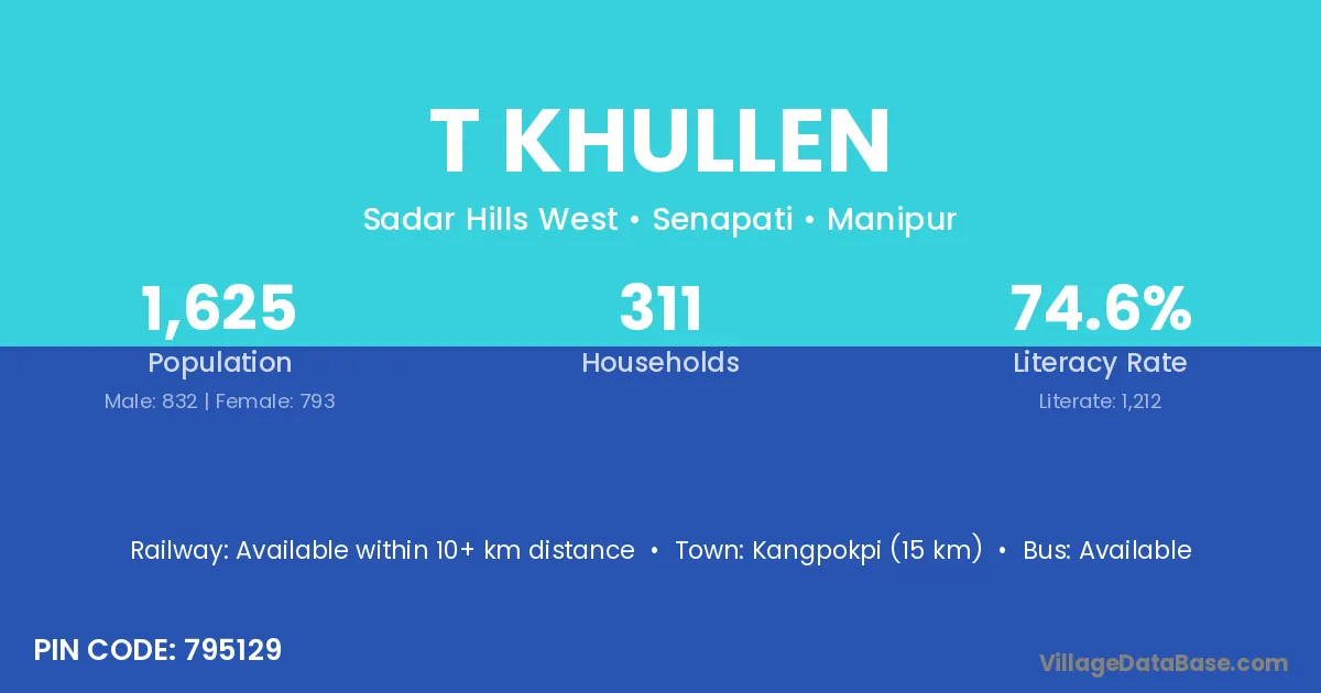 Kangpokpi (15 km) is the nearest town to T Khullen village for major economic activities and is located approximately 15 km away.