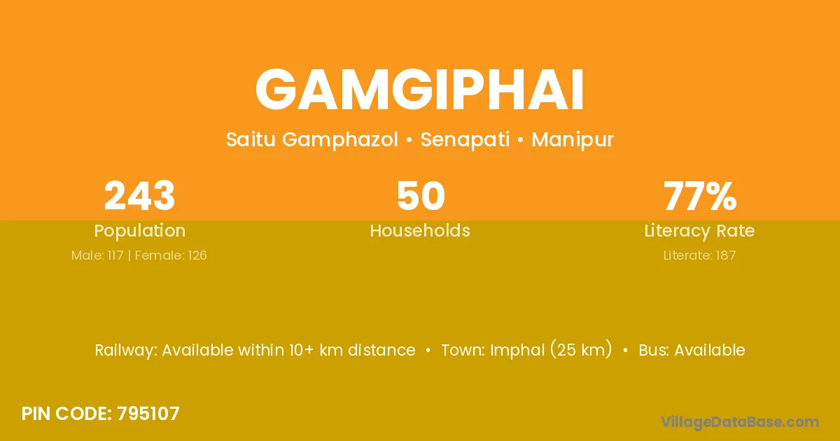 Imphal (25 km) is the nearest town to Gamgiphai village for major economic activities and is located approximately 25 km away.