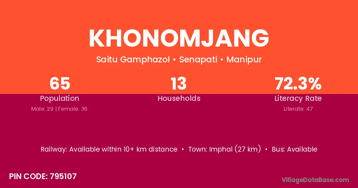 Imphal (27 km) is the nearest town to Khonomjang village for major economic activities and is located approximately 27 km away.
