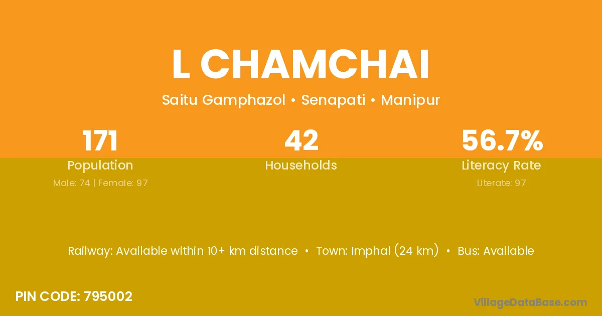 Imphal (24 km) is the nearest town to L Chamchai village for major economic activities and is located approximately 24 km away.