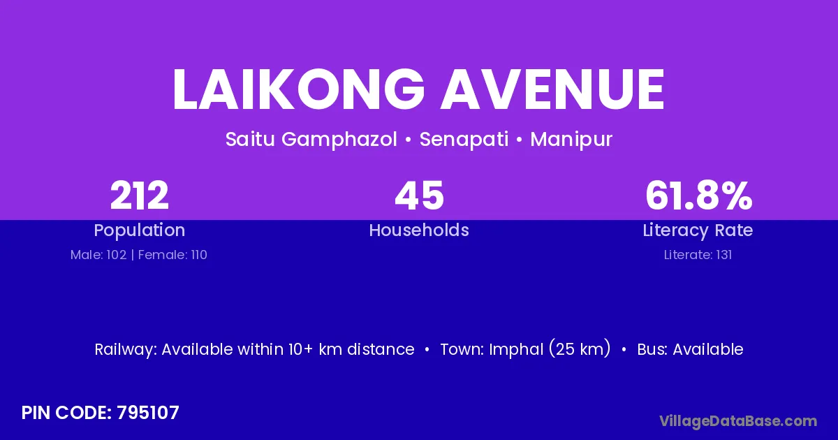 Imphal (25 km) is the nearest town to Laikong Avenue village for major economic activities and is located approximately 25 km away.