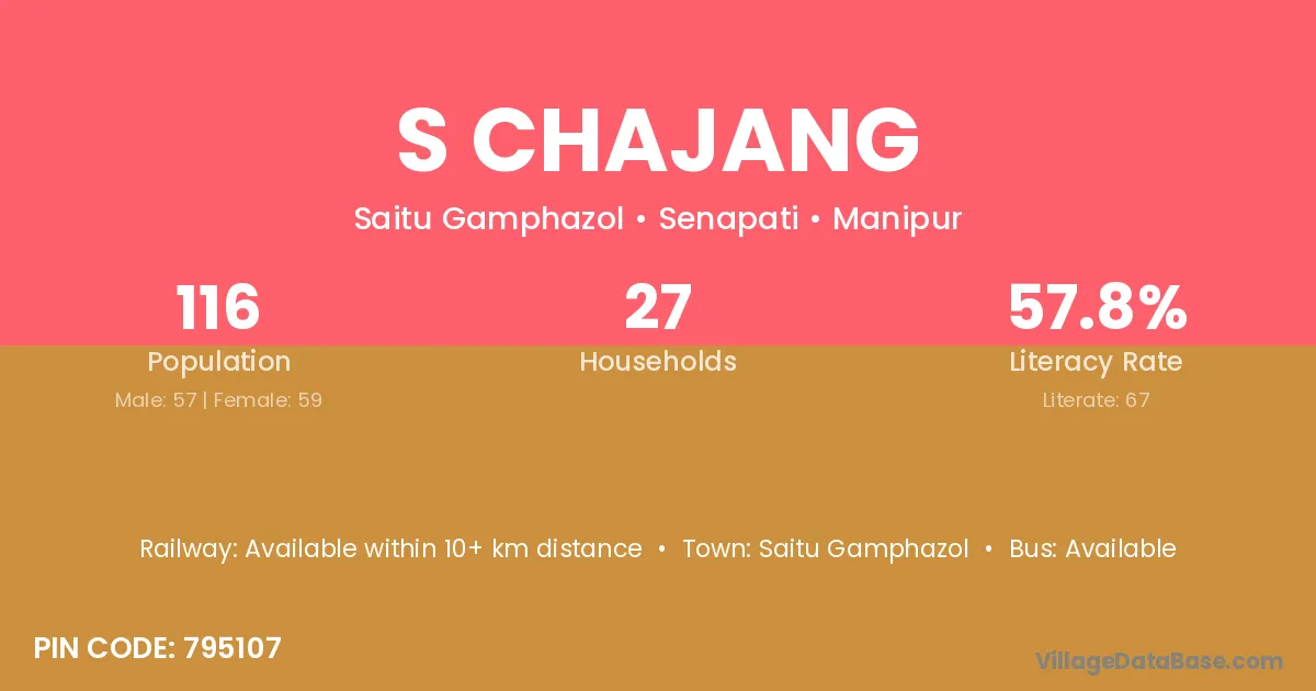 S Chajang village has a total population of 116 people, of which 57 are males and 59 are females.