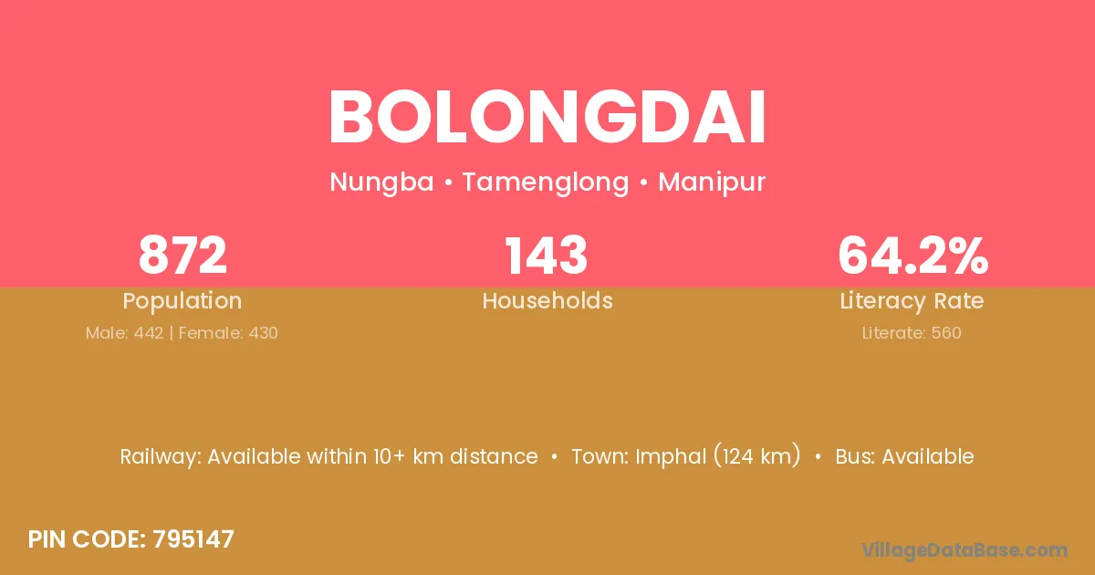Imphal (124 km) is the nearest town to Bolongdai village for major economic activities and is located approximately 124 km away.