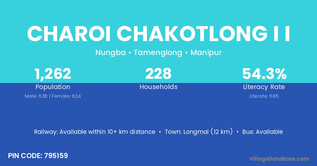 Charoi Chakotlong I I village has a total population of 1,262 people, of which 638 are males and 624 are females.