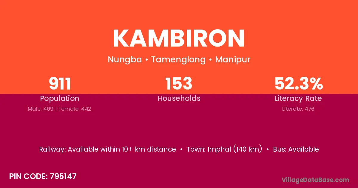 Imphal (140 km) is the nearest town to Kambiron village for major economic activities and is located approximately 140 km away.
