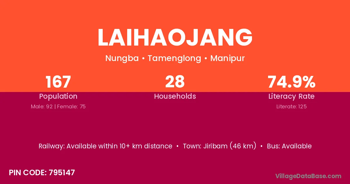 Jiribam (46 km) is the nearest town to Laihaojang village for major economic activities and is located approximately 46 km away.