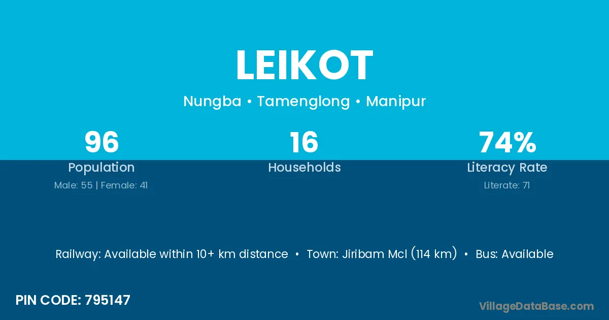 Jiribam Mcl (114 km) is the nearest town to Leikot village for major economic activities and is located approximately 114 km away.