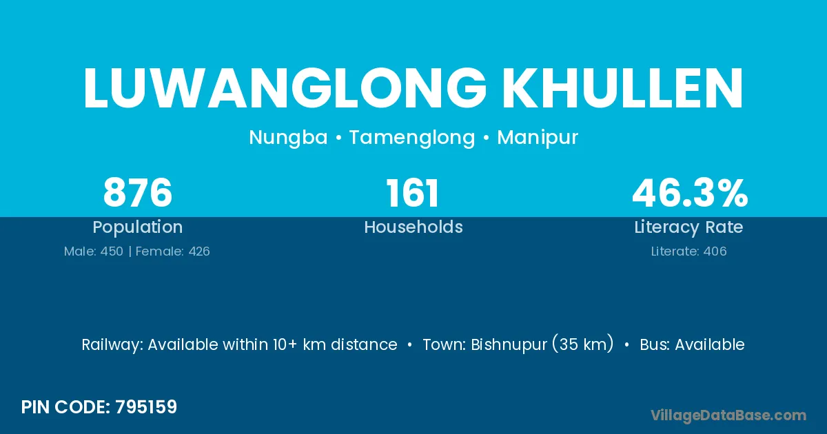 Bishnupur (35 km) is the nearest town to Luwanglong Khullen village for major economic activities and is located approximately 35 km away.