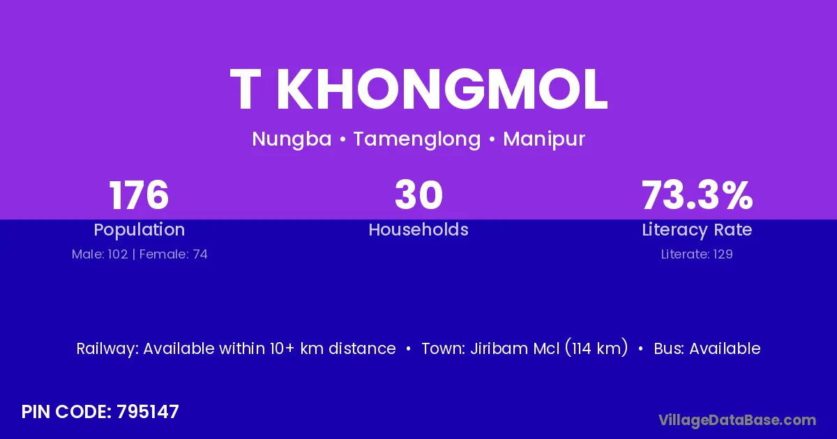 Jiribam Mcl (114 km) is the nearest town to T Khongmol village for major economic activities and is located approximately 114 km away.